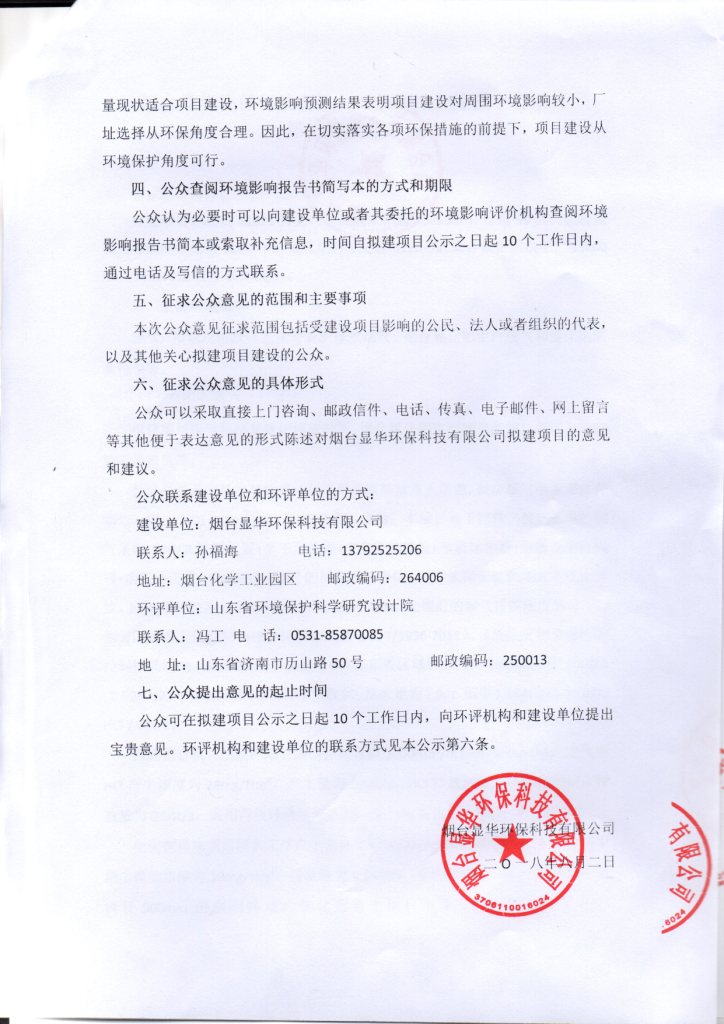 烟台显华环保科技有限公司危废综合处置中心项目 环境影响评价第二次信息公示