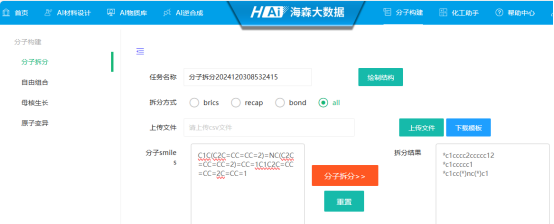 3.分子构建:平台内置了强大的分子构建工具,支持分子拆分、自由组合、母核生长、骨架变异、原子变异等多种构建方式。用户可以根据自己的需求,自由设计并生成大量分子结构,为材料创新、新药开发等提供源源不断的灵感与素材。